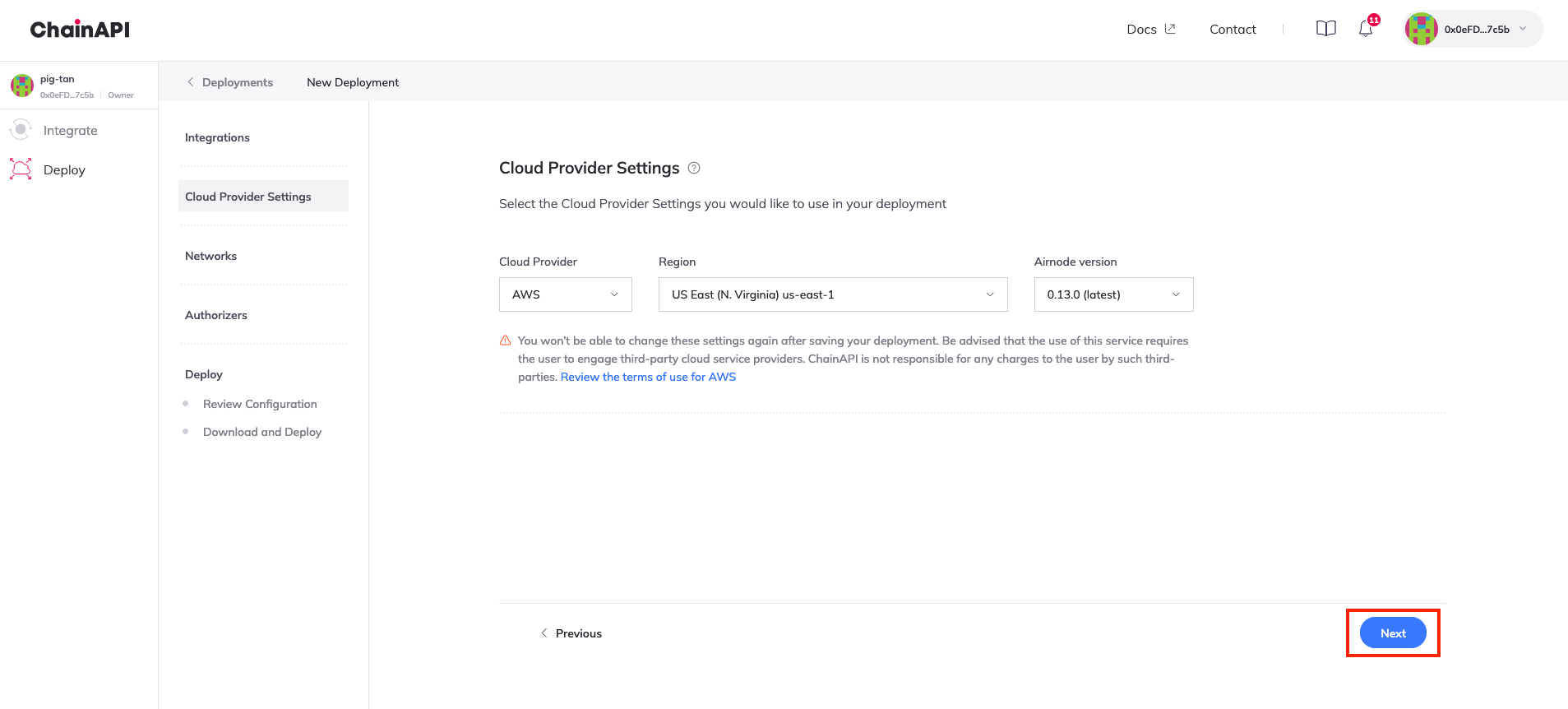 Select the cloud provider you would want to use for your deployment. You can choose between AWS or GCP. Choose the region and the Airnode version and click on Next.