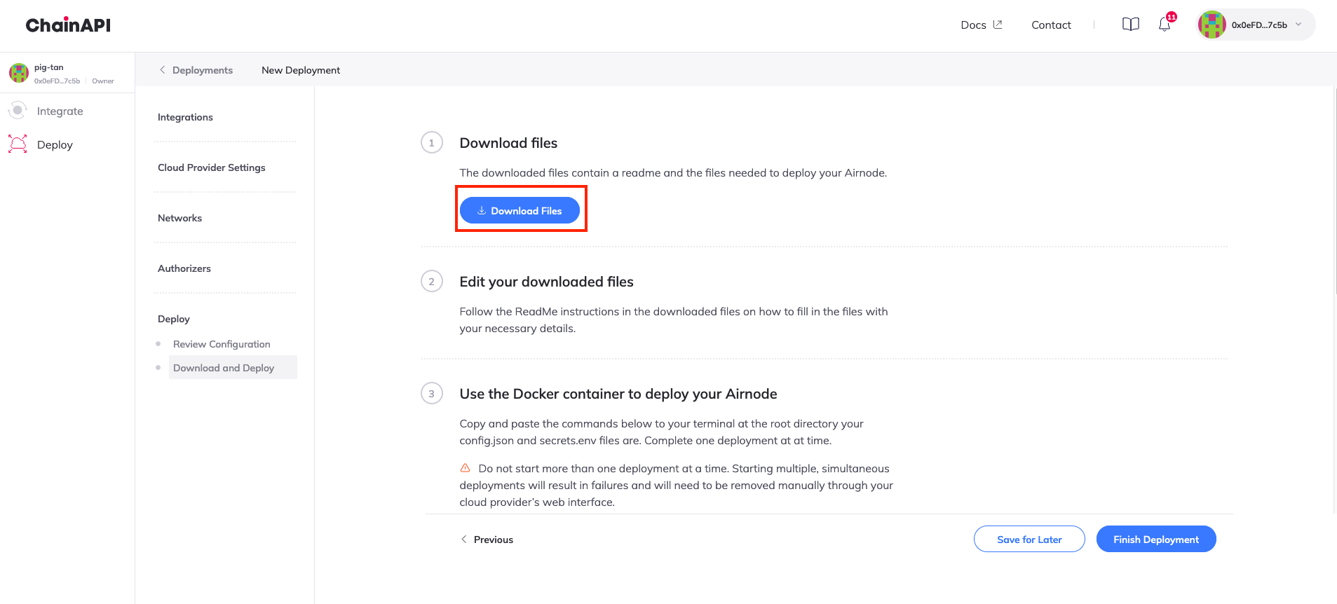 You will now be redirected to download the configuration files for your Airnode. Click on Download Files to download the configuration file.