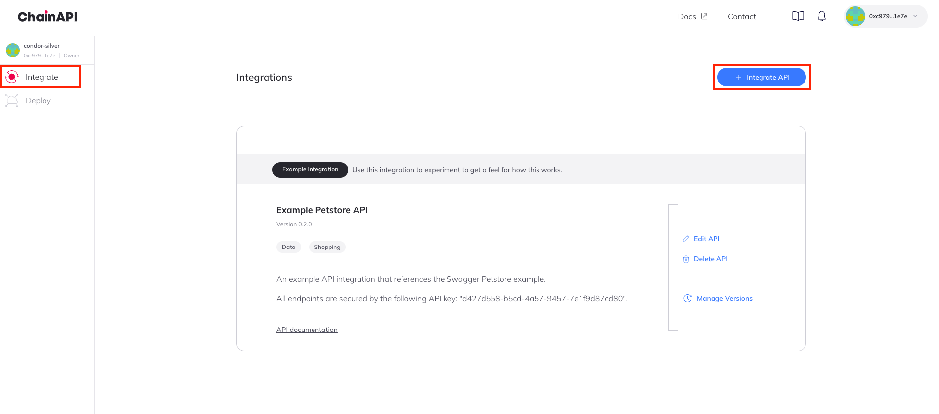 To create a new integration, click on the Integrate button on the top left corner of the dashboard and select Integrate API.
