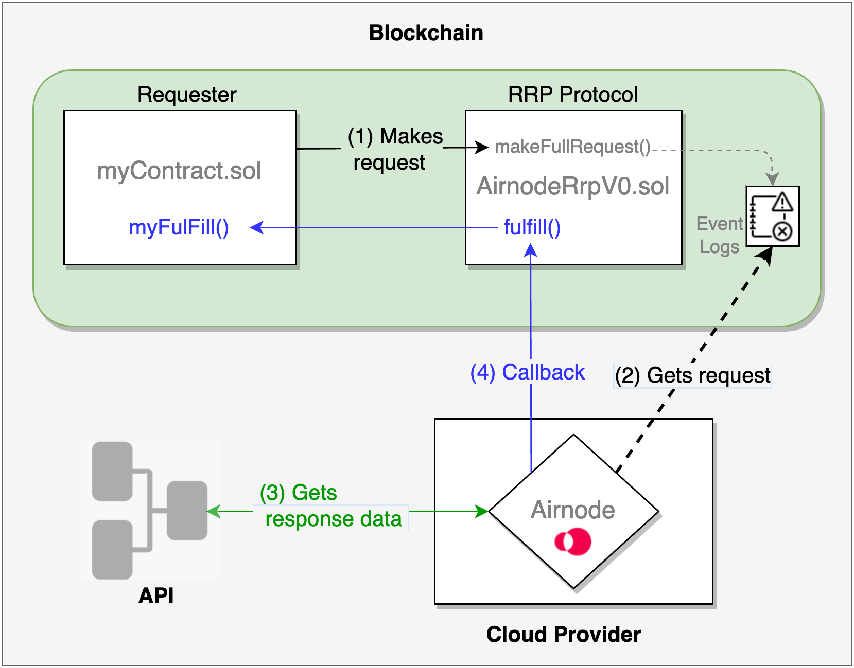 In the diagram below a requester makes a request to the on-chain RRP protocol contract (AirnodeRrpV0.sol) that adds the request to its event logs. During its run cycle the off-chain Airnode accesses the event logs, gets the requested data from the the API provider, then performs a callback to the requester.